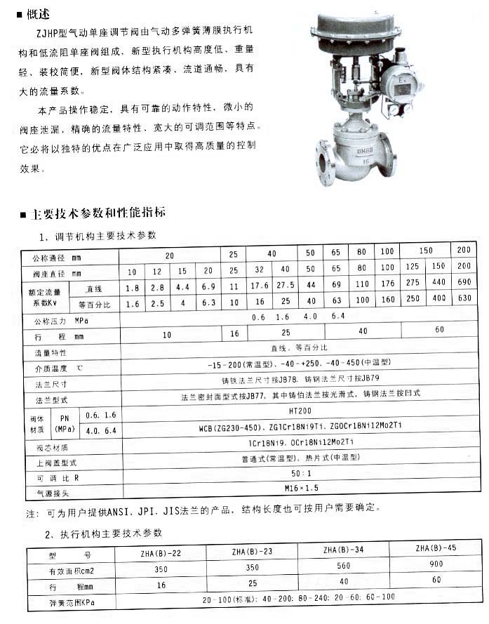 ZJHP型氣動單座調節(jié)閥由氣動多彈簧薄膜執(zhí)行機構和低流阻單座閥組成。新型執(zhí)行機構高度低、重量輕、裝校簡便,新型閥體結構緊湊、流道通暢,具有大的流量系數(shù)。