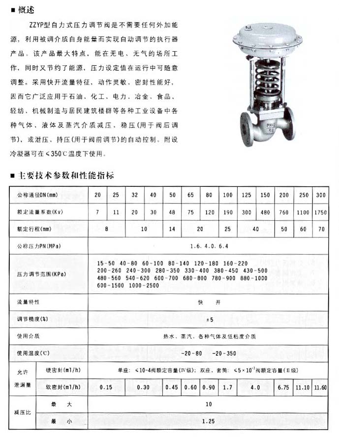 ZZYP型自力式壓力調(diào)節(jié)閥是不需要任何外加能源,利用被調(diào)介質(zhì)自身能量而實(shí)現(xiàn)自動(dòng)調(diào)節(jié)的執(zhí)行器產(chǎn)品,該產(chǎn)品***大特點(diǎn),能在無(wú)電、無(wú)氣的場(chǎng)所工作,同時(shí)又節(jié)約了能源,壓力設(shè)定值在運(yùn)行中可隨意調(diào)整。采用快開(kāi)流量特征,動(dòng)作靈敏,密封性能好,因面它廣泛應(yīng)用于石油、化工、電力、冶金、食品、輕紡、機(jī)械制造與居民建筑樓群等各種工業(yè)設(shè)備中各種氣體、液體及蒸汽介質(zhì)減壓、穩(wěn)壓(用于閥后調(diào)節(jié))、或泄壓、持壓(用于閥前調(diào)節(jié))的自動(dòng)控制、附設(shè)冷凝器可在<350C溫度下使用。